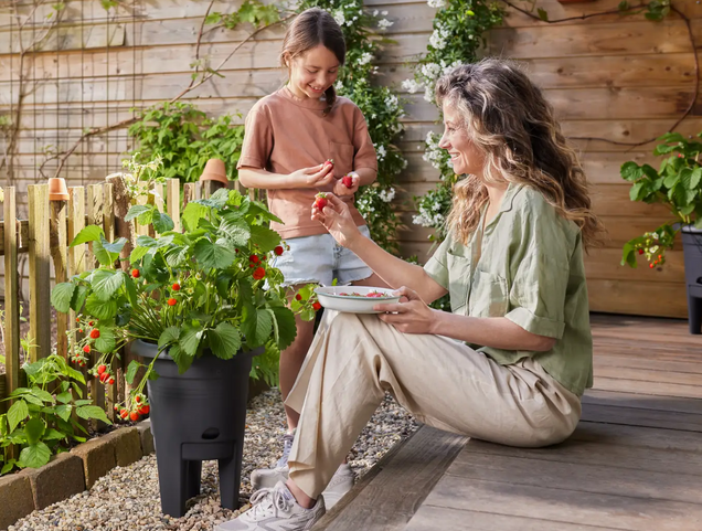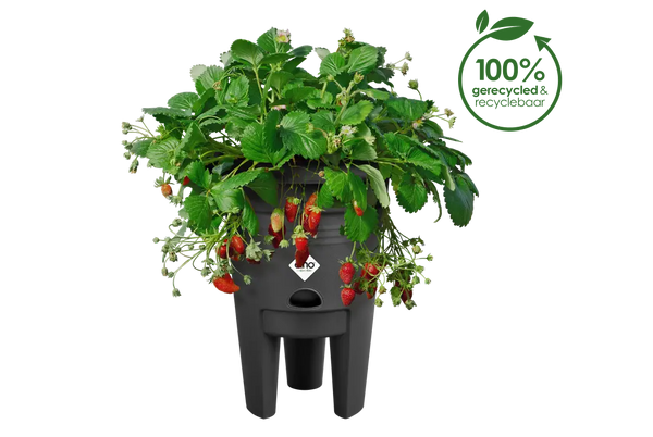 Der Topf wird von Elho aus 100% recyceltem Kunststoff hergestellt und ist speziell für den Anbau von Erdbeeren konzipiert. Die Erdbeerpflanzen sind 100% biologisch angebaut – du bekommst gleich drei Stück, die perfekt in den Topf passen! Erde und Hydro-Pellets zum Umtopfen sind im Paket enthalten.
