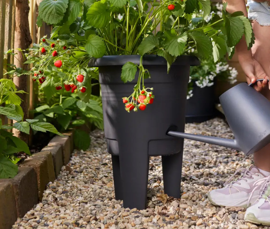 Die Beine haben eine wichtige Funktion: Erdbeeren lassen sich gerne baumeln. Der extra breite Topfrand gibt der Pflanze ausreichend Halt und verhindert, dass die Stiele der Erdbeeren abknicken.