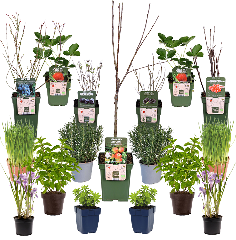 Alle Pflanzen sind klein, wenn sie bei dir ankommen, aber sie wachsen schnell, sobald sie eingepflanzt sind. Die Apfel- und Birnbäume sind etwa 100 cm hoch, die Obststräucher und der Feigenbaum 50 cm und alle Kräuterpflanzen 20 cm.