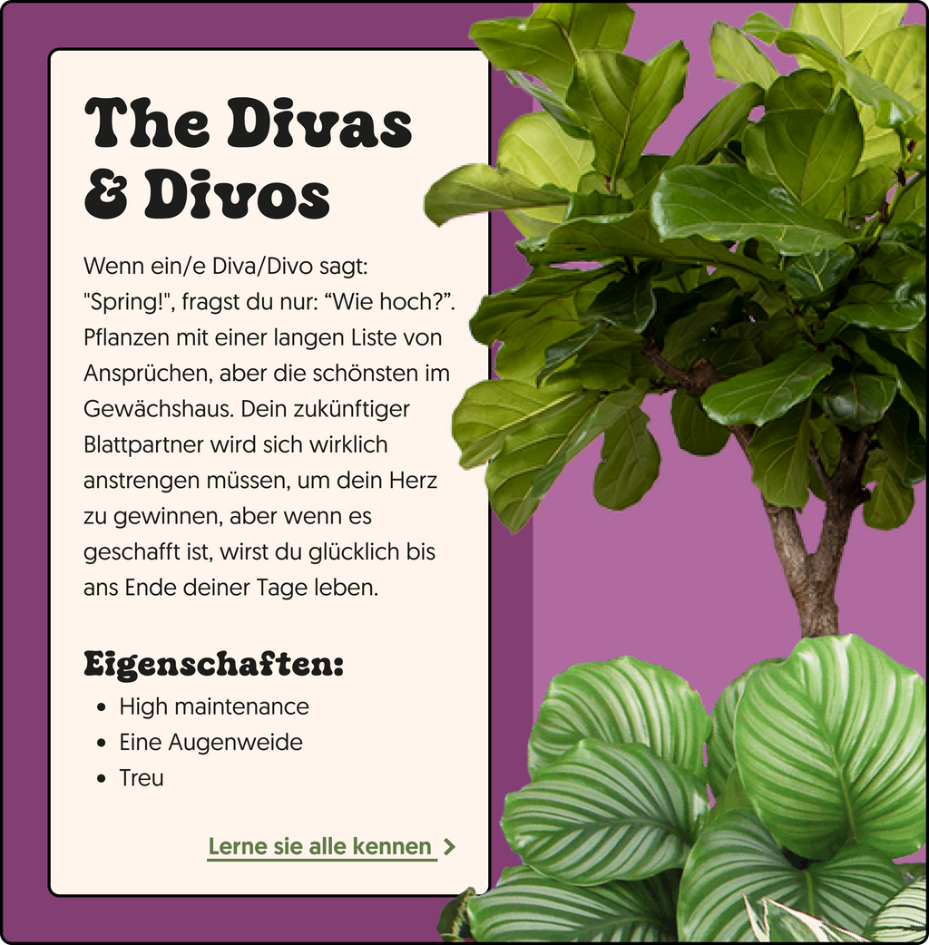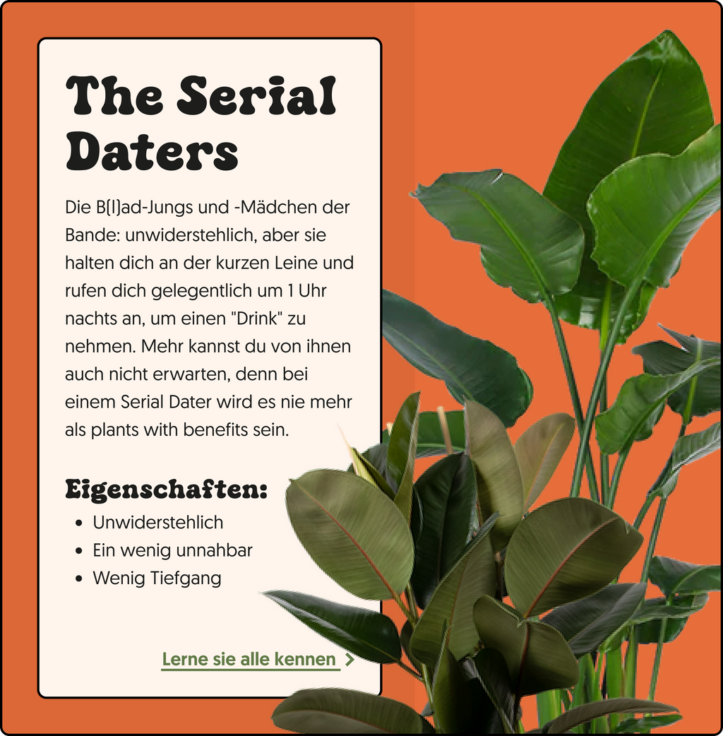 Es ist höchste Zeit, die Liebe zwischen Menschen und unseren pflanzlichen Mitbewohnern zu entfachen. Schwüle Nächte, feuchte Blumenerde und eine gesunde Portion Humor. Bist du bereit, dein Soilmate zu treffen? Find in 5 Fragen heraus, welcher Typ zu dir passt!